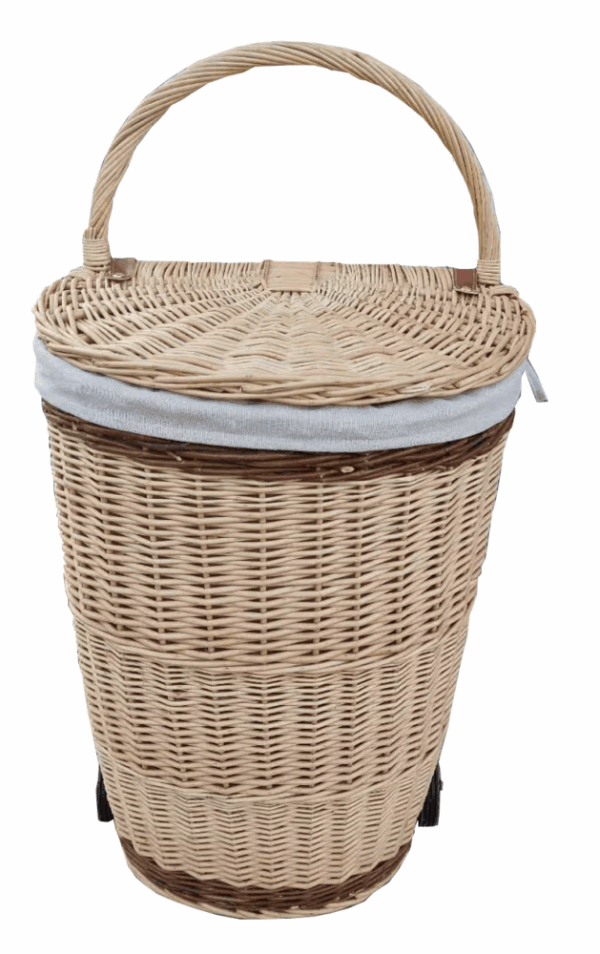 Full buff and green willow shopping basket with lining and wheels.